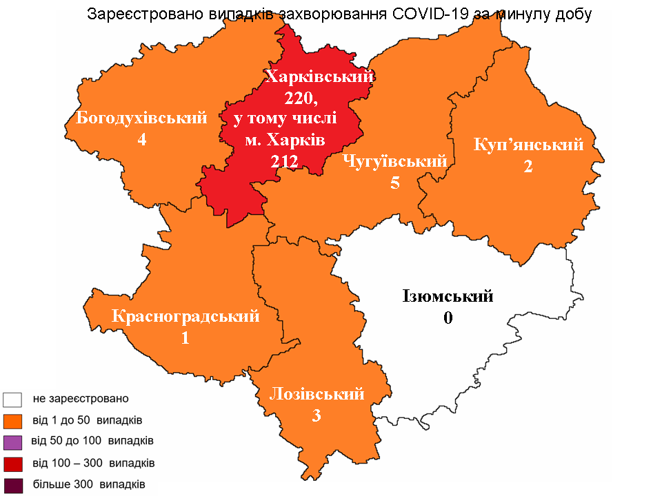 Діагноз COVID-19 вдалося підтвердити у 5 жителів Чугуївського району, 4 – Богодухівського та 3 – Лозівського районів. Крім того, 2 випадки захворювання в Куп'янському районі та 1 – у Красноградському районі.