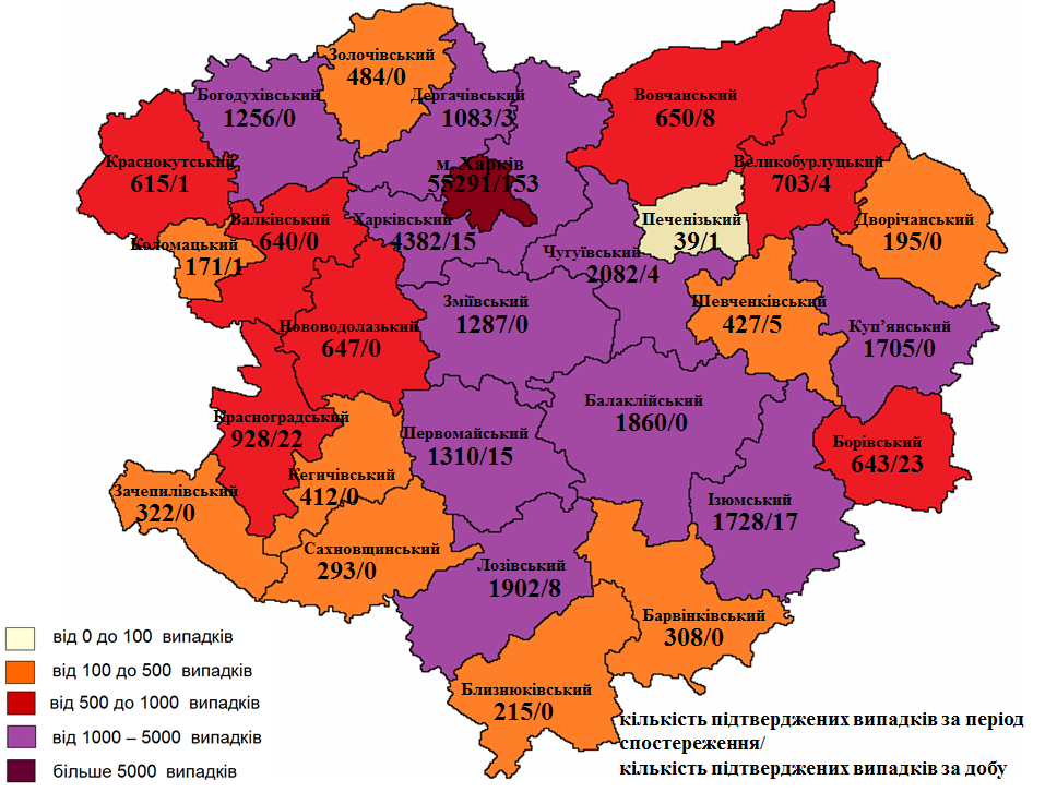 За даними Харківського обласного лабораторного центру, 153 з щойно виявлених пацієнтів – жителі Харкова. Також 45 нових випадків виявили в Ізюмському районі, 23 у Лозівському, 22 у Красноградському районі, 18 у Харківському, 17 у Чугуївському і 2 у Богодухівському.