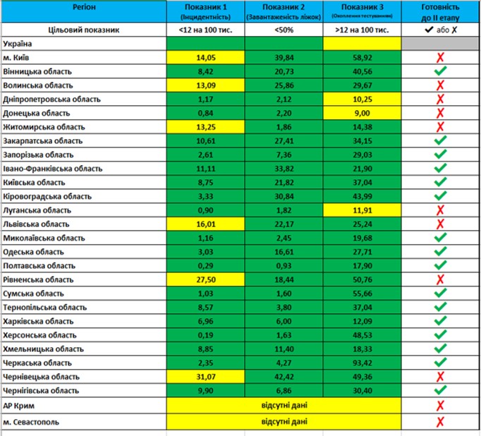 Готовність областей до другої хвилі виходу карантину визначається за кількома критеріями: інцидентність, завантаженість ліжок у медзакладах та кількість ПЛР та ІФА-тестів.
