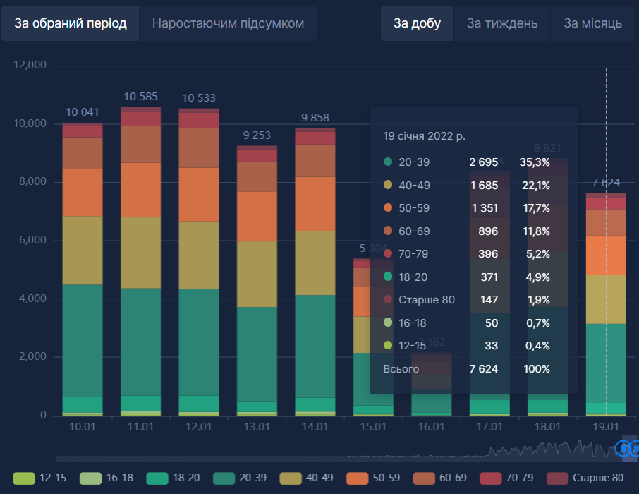 Найбільше вакцинувалися люди віком від 20 до 39 років – 2 тисячі 695 щеплень (35,3 % від загальної кількості).
