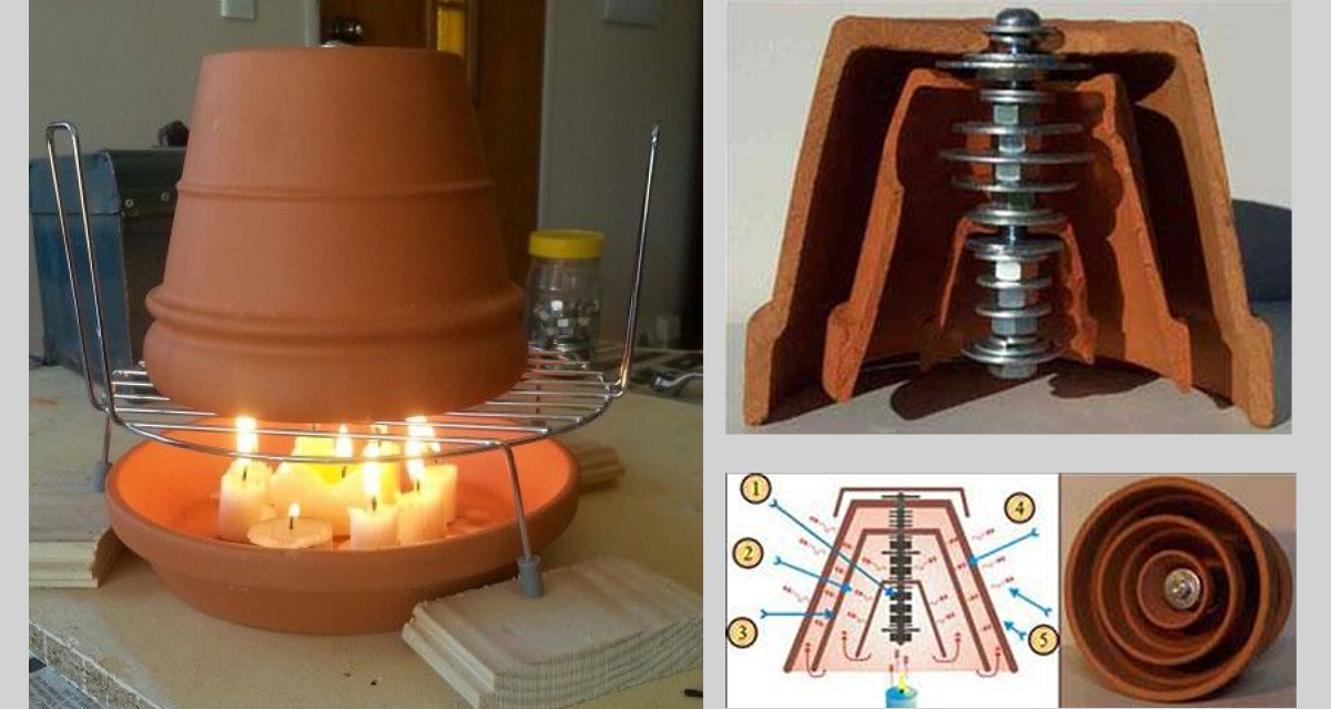 Принцип роботи простий – тепле повітря від свічок підіймається вверх, «вловлюється» горщиками, які відповідно нагріваються та довго його тримають.