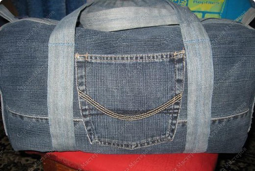 Є ще такий варіант. Тут знадобиться двоє штанів – увага! – з цілими холошами. Відрізати верх, з нього можна взяти нашивні кишені. Беруться тільки холоші. Їх розпороти, викроїти саму сумку. Дно окремо вирізати не треба. Це буде суцільна джинсова тканина. Планки для блискавки, ручки, боковини викроюються з холош других джинсів. Кишені настрочити на основні деталі, а можна обійтися без них. Основні деталі сумки зшити. Пришити ручки, бажано довгі, щоб опоясували всю сумку: такі швидко не відірвуться. Потім вшити блискавку на планках і боковини. Усе це зшивається з виворітнього боку. Для міцності пришиваємо всередину підкладочний матеріал або наклеюємо флізелін.