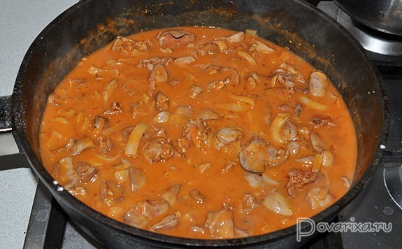 Знадобляться: курячі шлуночки – 200 г, курячі сердечка – 200 г, куряча печінка – 200 г, ріпчаста цибуля – 1 шт., томатна паста – 1–1,5 ст. л., кетчуп – 2–3 ст. л., борошно – 1–2 ст. л., соняшникова олія – для смаження, цукор – 1–2 ч. л., сіль, чорний мелений перець – за смаком.