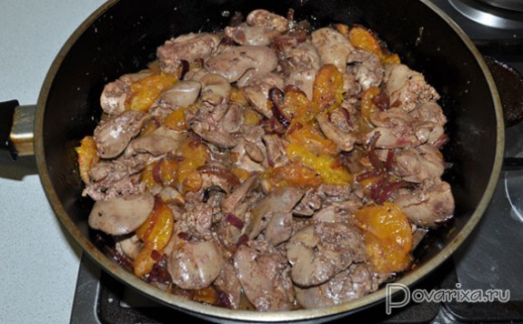 Знадобляться: куряча печінка – 800 г, ріпчаста цибуля (червона) – 1–2 шт., мандарини – 3–4 шт., часник – 2–3 зубчики, соєвий соус – 2–3 ст. л., сіль, чорний мелений перець – за смаком, цукор – 1,5–2 ст. л., соняшникова олія – для смаження.