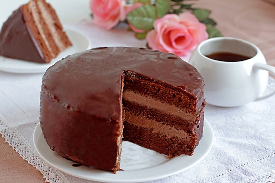 Приготувати глазур: у невелику каструльку покласти вершкове масло й шоколад, нагріти на середньому вогні, як тільки масло розтопиться, прибрати з вогню й розмішувати до повного розчинення шоколаду. Остудити глазур і полити нею торт, потім поставити готовий торт у прохолодне місце. Коли глазур захолоне, торт можна подавати на стіл.