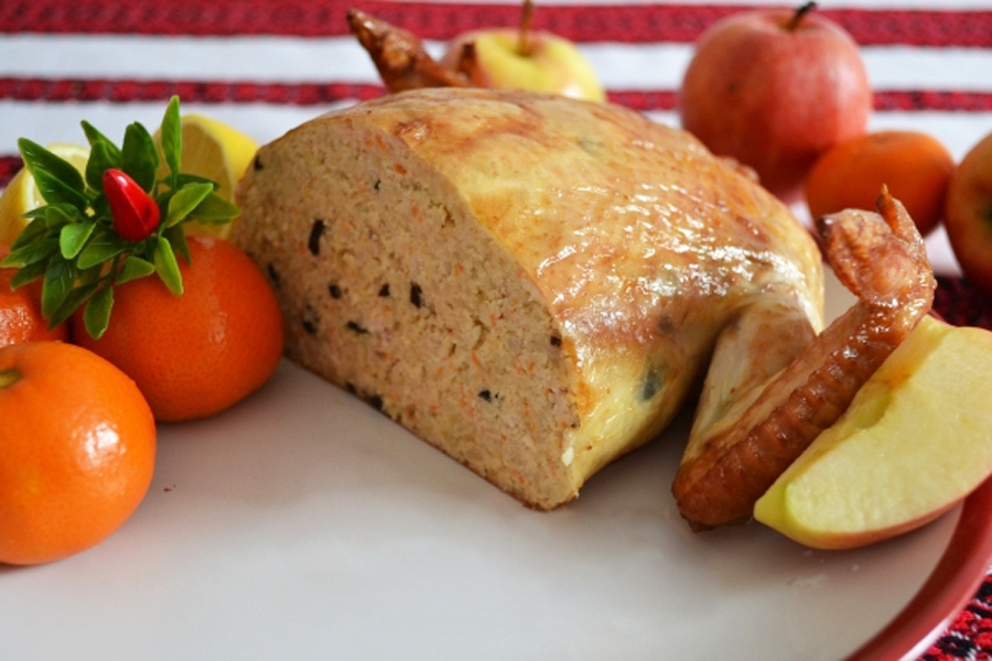 Куряче м’ясо зняти з кісток, нарізати невеликими шматочками й перемолоти через м’ясорубку, слідом за м’ясом перемолоти зварений булгур, а потім – овочі. Посолити й поперчити фарш за смаком, перемішати. Щоб він був в’язким, додати куряче яйце, всипати нарізані кружальцями оливки і знову все перемішати. Мариновану курячу шкіру наповнити фаршем, щільно натоптувати не потрібно, інакше під час запікання шкіра лопне. Зашити тонкими нитками або заколоти отвори шпажками та запікати в розігрітій до 180 градусів духовці 30 хвилин. Дати трохи охолонути, порізати на порційні частини й подавати на стіл.