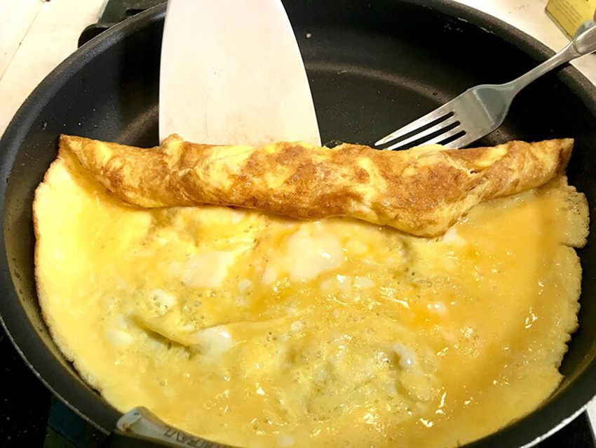 Збити яйця з молоком, додавши сіль з перцем. Оптимально спочатку збити яєчні білки в міцну піну, а потім акуратно влити жовтки з молоком, не перестаючи збивати масу, якщо міксером — то на середній швидкості. Для щільності можна додати трохи борошна або кукурудзяного крохмалю, але це варто робити, якщо замість повітряної маси хочеться отримати швидше млинець. Також у суміш можна додати тертий сир. Сковороду злегка змастити олією, щоб готовий омлет не вийшов занадто жирним. Вилити суміш на сковороду і смажити близько 3 хвилин,