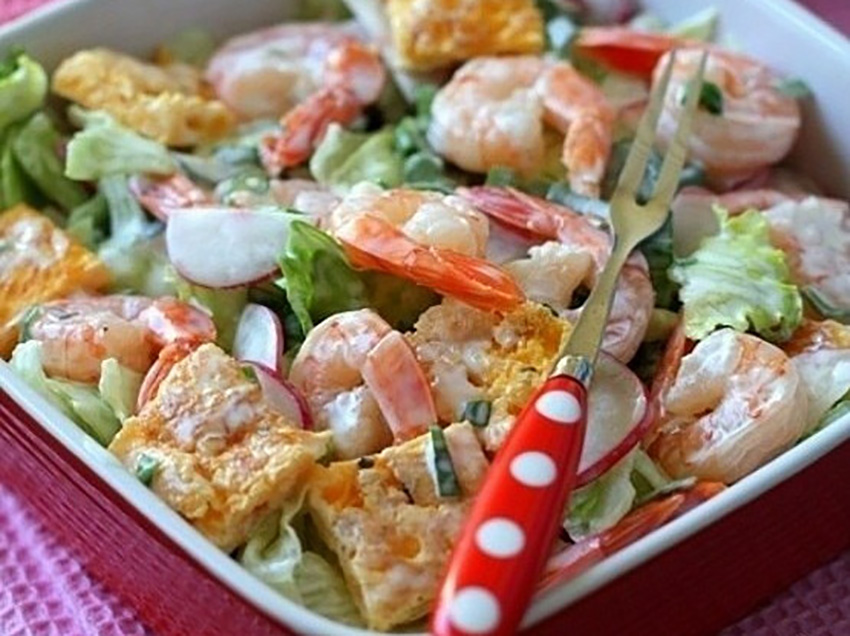 У цій страві чудово гармонують хрумкі нотки листків салату і шматочків редиски, соковитість вишуканого делікатесу — креветок і ніжність сирного омлету. А ще салат дуже смачний, тож обов’язково сподобається.