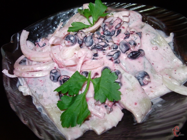 Готуємо спочатку заправку. Дрібно нарізаємо солодку (білу або червону) цибулину. Змішуємо сметану з медом, чорним перцем, цибулею і кропом, додаємо чорну смородину й ретельно перемішуємо. Ягоди смородини злегка розчавлюємо ложкою, щоб вони випустили сік.