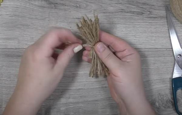 Застосовуємо техніку виготовлення помпона: прикладаємо вздовж смужки картону шматок мотузки, відрізаємо і починаємо намотувати мотузку поперек картону. Шматок мотузки зв’язуємо, виймаємо картон і розрізаємо моток з протилежного боку зав’язки. Виходить такий собі маленький сніп. Розпушуємо його кінці з обох боків на тоненькі ниточки, щоб зачіска була пишнішою. Край можна підрізати ножицями. Кладемо чубчик на ріжки бичка, приклеюємо та розправляємо зачіску по діаметру і оформлюємо мордочку та тулуб бичка.
