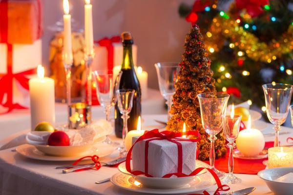 Класти «справжній» новорічний подарунок не варто: його місце — під ялинкою, час отримання — ранок. Святкову атмосферу підкреслить композиція в центрі столу. Вона має бути невисокою, щоб не заважати двом зустрічатися поглядами. Це може бути декілька ялинкових гілочок, прикрашених іграшками. Якщо є красива скляна тареля або срібний піднос, на них можна покласти червоні яблука, мандарини, апельсини, горіхи, загорнуті у фольгу, контрастні за кольором цукерки, ялинкові гілочки та прикраси — усе це в будь-яких пропорціях, головне, щоб було красиво. Ефектними будуть одинокі ялинкові гілочки у високих вузьких келихах. І навпаки — у низеньких круглих скляних вазочках чи іншій посудині маленькі кульки, дрібні яскраві прикраси з гілочками вічнозелених рослин. Якщо є красивий глиняний посуд і вишита серветка, а господиня не цурається національного колориту, можна оформити такий собі калиново-ялинковий острівець із ялинковими прикрасами. Якщо ж дуже кортить, то можна навіть поставити на новорічний стіл і міні-ялинку. Або це будуть декілька (а найкраще — одна) маленьких гілочок посеред столу, прикрашені відповідно до величини чи зовсім без прикрас, або на краєчку можна поставити більшу штучну ялинку з набором іграшок до неї. Власне кажучи, так само можна поставити й Діда Мороза або Сніговика.