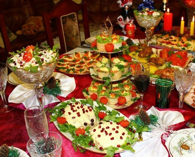 Варіантів прикрашання столу може бути безліч, залежно від того, хто і в якій кількості за нього сідатиме (або підходитиме — таке теж можливе). Тож розпочнемо з найбільш «бунтарської» частини святкуючих — молодіжної компанії. Молодь більше цікавить спілкування, ніж наповнення шлунків. Хоча щодо напоїв... Ладно, промовчимо, бо свято ж. Тож і антураж може не відповідати традиційним вимогам. Приміром, ялинка може бути не живою, і навіть не штучною, а паперовою, що прикріплена до стелі. Або й зовсім намальованою на стіні або зробленою як силует з гірлянди. Хоча на краєчках гілочок можуть висіти найсправжнісінькі ялинкові прикраси: кульки, бурульки, сніговики тощо. І стіл може бути фуршетним, тобто, таким, біля якого не сідають, а стоять і вибирають собі хто що хоче і коли хоче. У такому разі його обладнують десь осторонь, причому не обов’язково власне на столі — це можуть бути й різнорівнево покладені дошки або ящики (звичайно ж, устелені скатертиною або якоюсь тканиною, що має святковий вигляд).