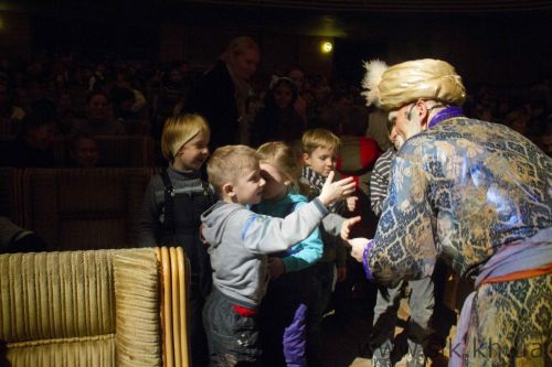 Вистава новорічна, і перед тим як розкриється завіса, дітей вітають Дід Мороз, Снігуронька та Хаттобич. У фіналі вистави Хоттабич виходить в зал для глядачів і діти безпосередньо спілкуються з добрим чарівником.