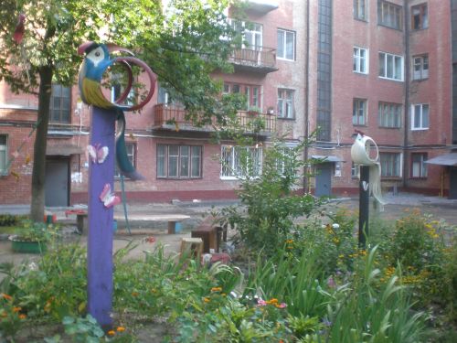 Цього літа мешканці будинків у районі Холодної гори, повертаючись із відпустки, не впізнавали власного подвір’я. Непримітний і похмурий двір перетворився на екзотичний куточок із дикими тваринами, рослинами, іграшками і прикрасами. Унікальний ландшафтний дизайн усього за місяць-два створила не спеціалізована фірма, а звичайна мешканка одного з будинків.