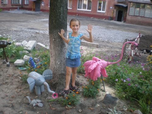 Навколо старої яблуні почав літати бджолиний рій, під африканськими пальмами сховалась піратська скарбниця, за якою наглядає з дерева мудра сова. А добробут і щастя двору стала приносити лелеча пара у гнізді. Врешті-решт сіра й непримітна клумба між старих п’ятиповерхівок перетворилась на екзотичний куточок, в якому приємно гуляти і розважатись дітям і дорослим. Авторка пластикового дизайну зупинятися на цьому не збирається, і планує створити нові прикраси для двору в наступному році.