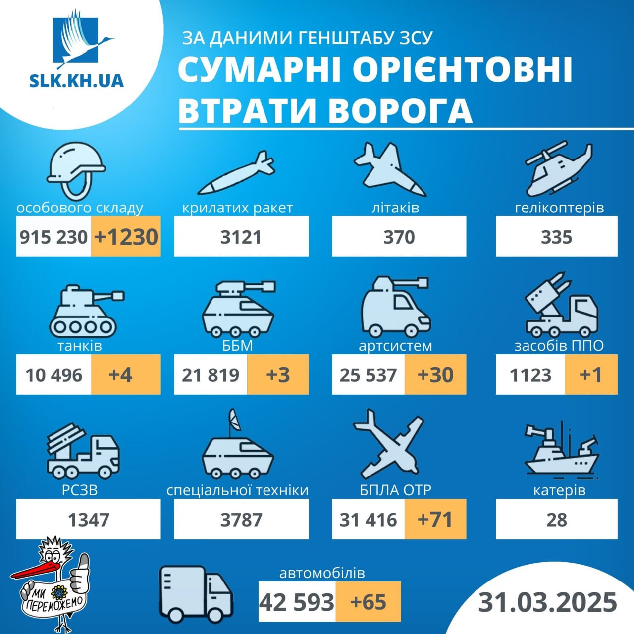 Про це пише «Слобідський край» із посиланням на ранкове зведення Генштабу ЗСУ 31 березня.