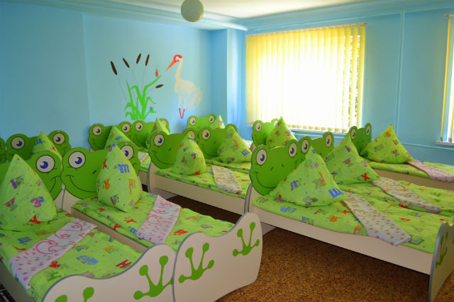 Сьогодні садок повністю готовий: стіни та сходинки розмальовані у кольори, зручні та оригінальні меблі, як-от ліжечка-жабенята, туалетні кімнати, підлаштовані під дітлахів, іграшки, книжки…