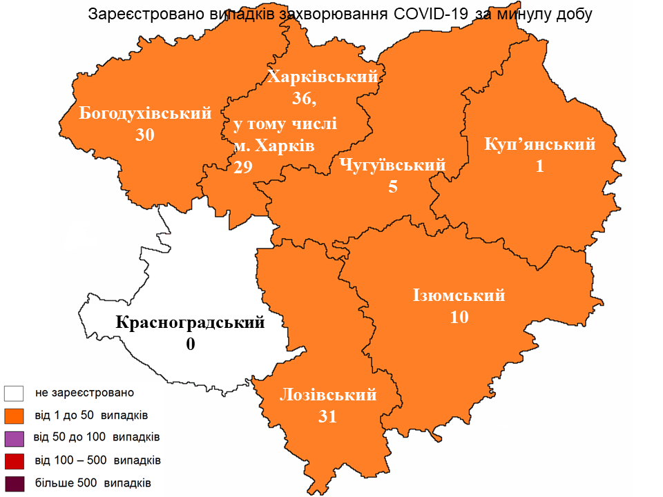 За кількістю хворих на COVID-19 лідирує Харківський район, тут виявлено 36 випадків захворювання, з них в обласному центрі – 29. За ним ідуть Лозівський район – 31 випадок та Богодухівський район – 30 випадків захворювання.