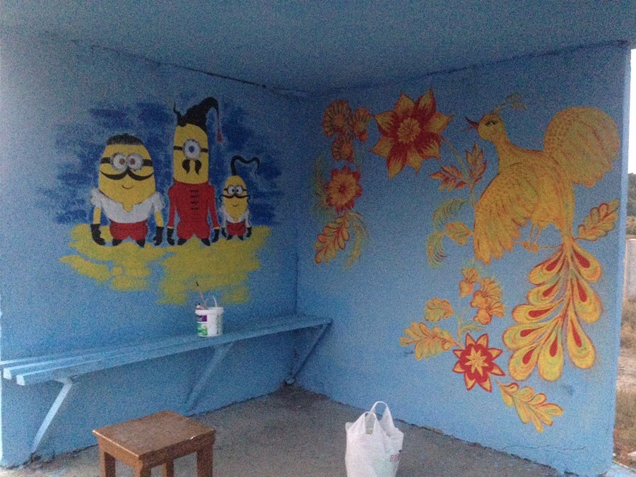 А далі діти отримали від голови селищної ради пропозицію розмалювати автобусну зупинку в селі Шляхове. Юних активістів зовсім не довелося вмовляти, вони стрімко зібралися, спершу поїхали зробити начерки проекту, а коли поїхали вдруге, вже розмалювали зупинку.