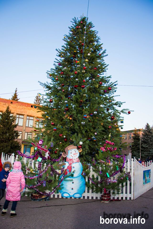 Збірну з живих дерев ялинку, висота якої 13 метрів, установили й у Боровій. Цього року на ялинці оновили іграшки, а також уперше проекспериментували з прикрашанням головної площі.
