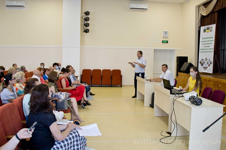 На робочій зустрічі в Пісочині були присутні не тільки самоврядовці, а й активні жителі громади, профільні спеціалісти структурних підрозділів Харківської ОДА та Харківської РДА, директори закладів і установ громади, представники бізнесу та керівництво проєкту з Києва.