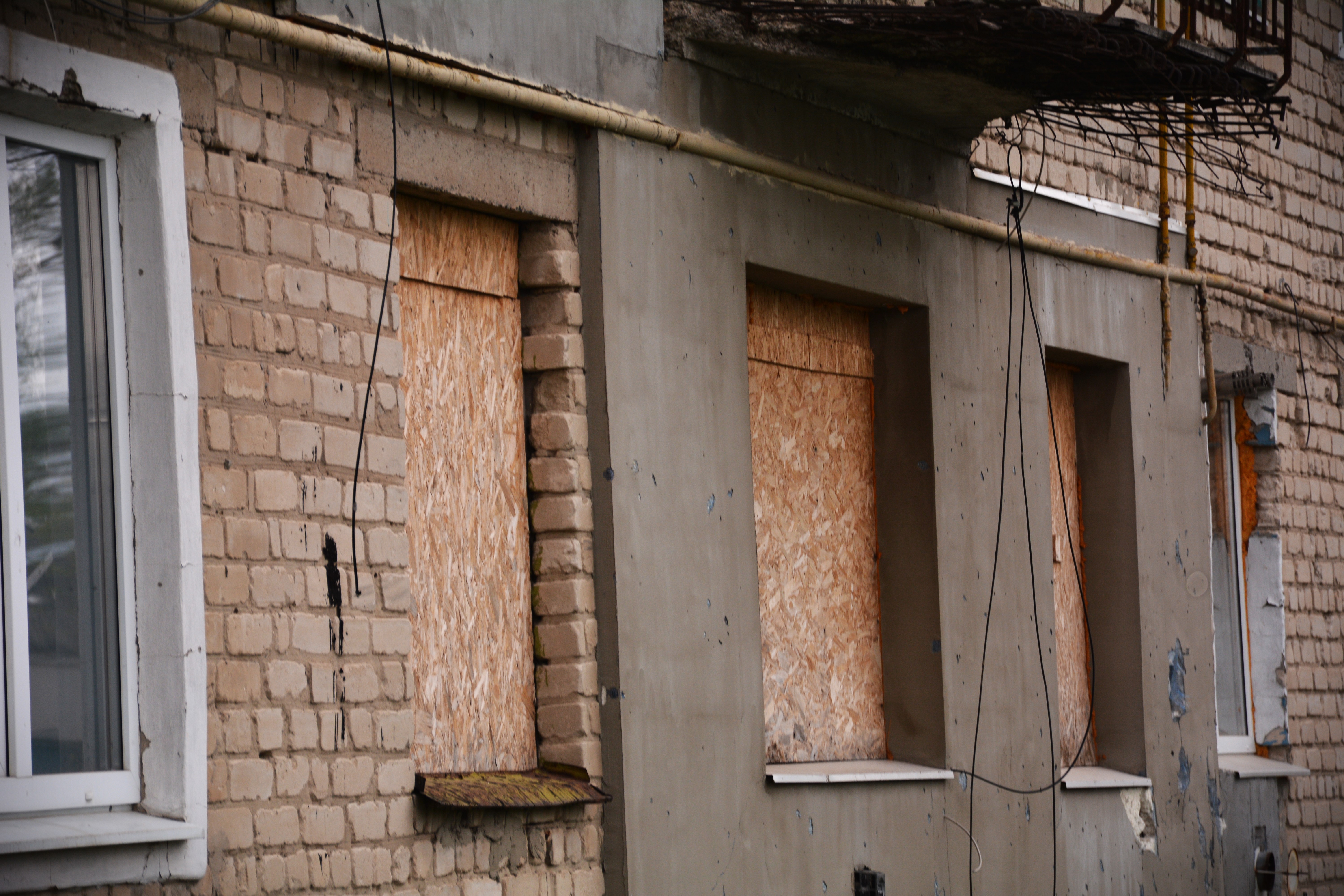 Утім, як би амбулаторію не відновлювали, наслідки обстрілів досі помітні на фасаді будівлі – табличка з назвою медзакладу побита, стіни також посічені уламками. А на другому поверсі будівлі вибите вікно – це вже квартира місцевих жителів, які досі не повернулися додому.