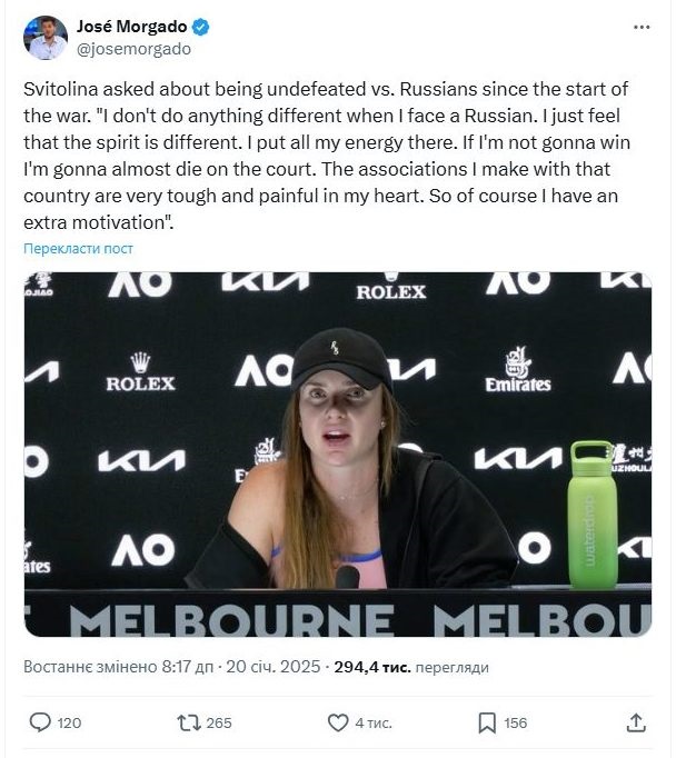 Як передає «Слобідський край», про свої перемоги над росіянками Світоліна розповіла португальському журналісту Жозе Моргадо.