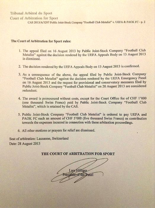 Спортивний арбітражний суд у Лозанні розглянув доцільність виступу харківського «Металіста» в нинішньому розіграші Ліги чемпіонів. У підсумку, CAS прийняв рішення про те, що харківський клуб в цьому сезоні виступати в Лізі чемпіонів не буде, sport.ua.
