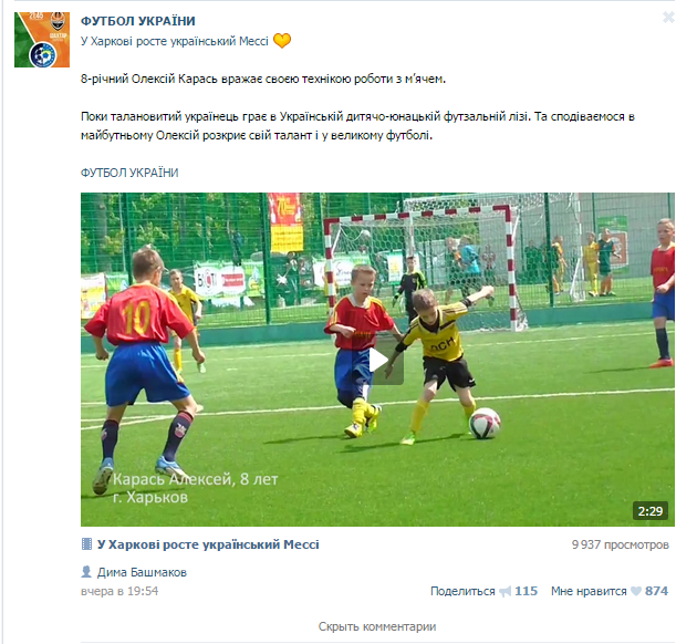 У всеукраїнському пабліку Футбол України розповіли, що герой ролика, восьмирічний Олексій Карась, учасник дитячо-юнацької футзальної ліги, вражає своєю грою у футбол і технікою роботи з м'ячем.