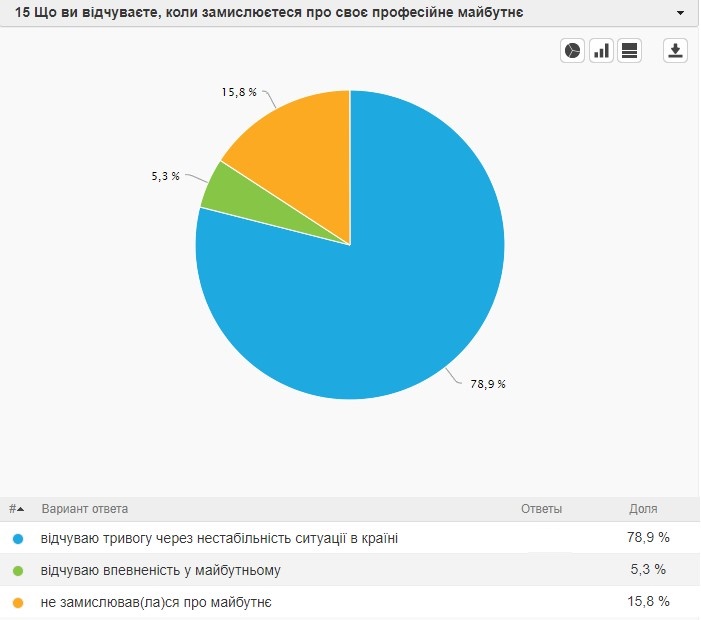 Щодо перспективи на майбутнє, 68,4 % опитаних вважають, що мають стабільну довгострокову роботу. 31,6 % заявили про протилежне. Водночас 78,9 % відчувають тривогу за своє майбутнє через нестабільність ситуації в країні, 15,8 % не замислювались про майбутнє й лише 5,3 % відчувають упевненість.