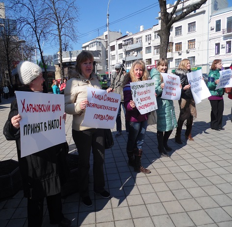 На плакатах активісти висунули неординарні пропозиції та заяви: «Харківський цирк увійшов в НАТО», «Олексіївка ввела війська на Павлове поле», «Холодна Гора ввела візовий режим», "Полтавський шлях став частиною Полтави".
