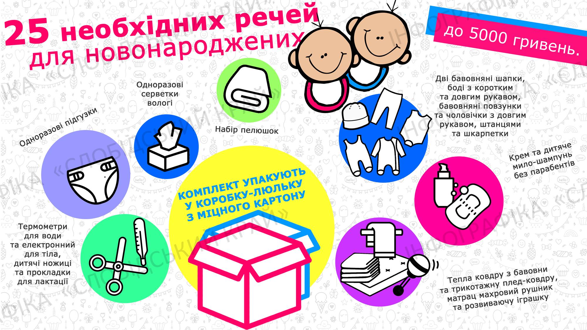 До пакунка ввійдуть 25 необхідних речей для новонароджених. Вартість такого комплекту складатиме до 5000 гривень.