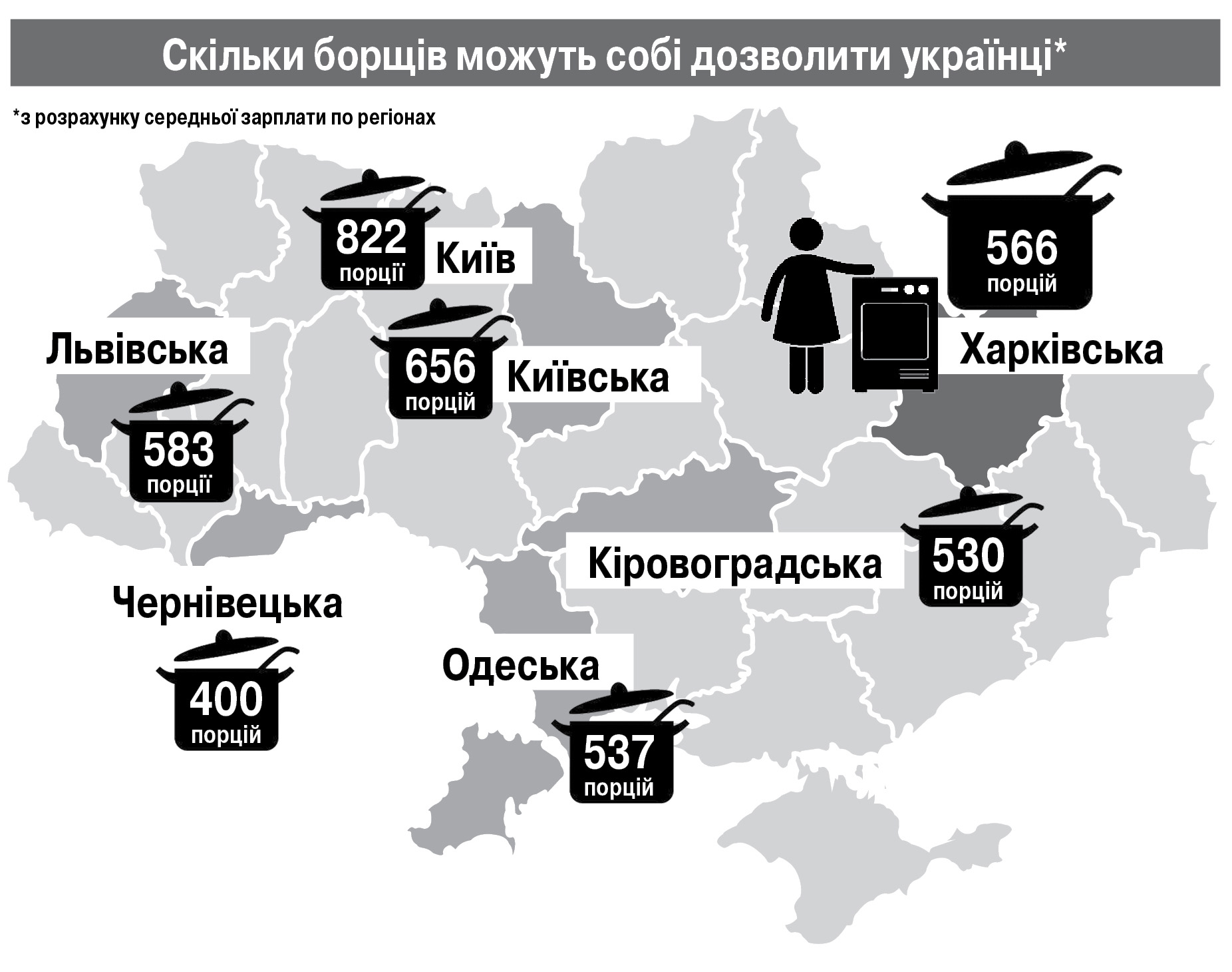 А от на Західній Україні борщовий набір, навпаки, дешевший. Для прикладу беремо Львівську область. Яловичину там продають населенню по 81,06 грн, картоплю - 4,38 грн, капусту - 9,2 грн, моркву - 10,35 грн, буряк - 6,31 грн, цибулю - 11,58 грн, олію - 28,78 грн, сметану - 26,46 грн. Загалом виходить 57,67 грн, або 6,92 грн тарілка. Середня зарплата на Львівщині 4039 грн. Це 583 тарілки.