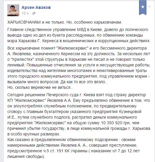 "Сьогодні рішенням Печерського суду м. Києва узятий під варту директор КП "Жилкомсервіс" Яковлєв О. А. Йому висунено звинувачення в тому, що він, зловживаючи службовим становищем, за попередньою змовою з головним бухгалтером вказаного підприємства Кузнєцовою І. Є., шляхом службового підроблення, розтратив гроші комунального підприємства "Жилкомсервіс" на загальну суму 10393920 грн, чим заподіяв збиток державі, в особі комунальної громади м. Харкова, в особливо великих розмірах.