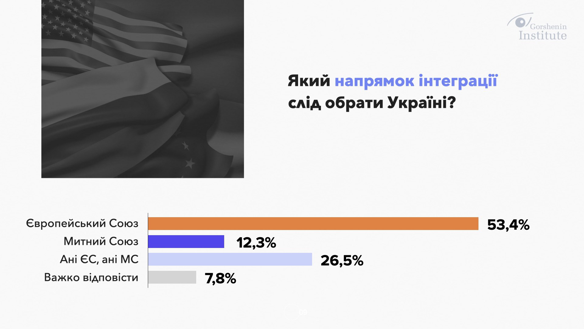 Більшість громадян (53,4 %) вважають, що Україні слід обрати напрямком інтеграції Європейський Союз. Лише 12,3 % українців висловили думку, що країні слід обрати для інтеграції Митний союз.