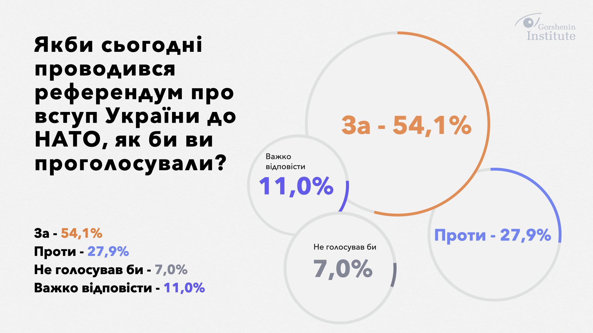 Якби сьогодні проводився референдум про вступ України в НАТО, більшість громадян (54,1 %) проголосували б за інтеграцію в Альянс.