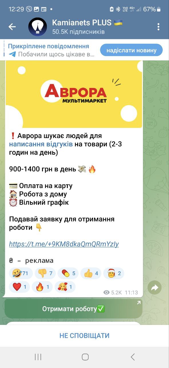 Скриншот повідомлення від шахраїв, які нібито пропонують роботу вдома з пакування подарункових наборів косметики для мережі «Аврора». Зверніть увагу на кількість підписників каналу, де було розміщене це повідомлення.