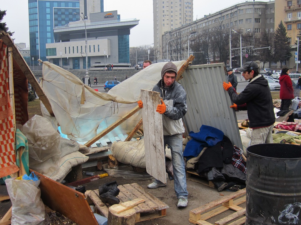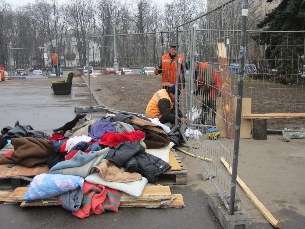Комунальники палять дерев'яні саморобні лави, якими користувалися активісти, вивозять паркан, розбирають намети.
