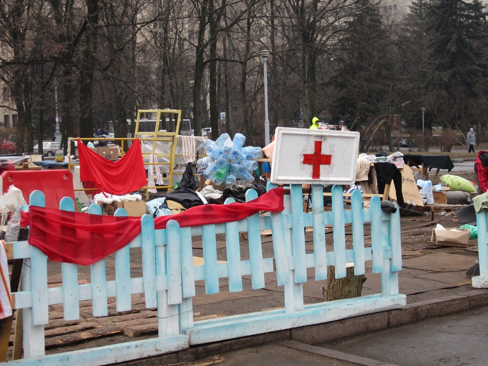 Навколо пам'ятника валяються ковдри, верхній одяг та взуття активістів, залишки їжі. Так, можна побачити банки із консервацією, хліб, почищену картоплю. Всюди розкидані пластикові каністри з-під води.
