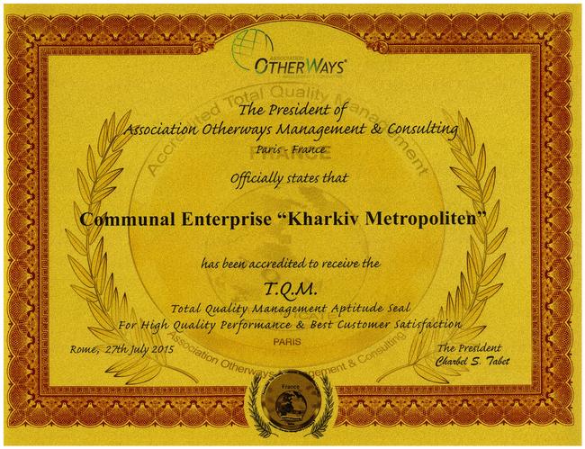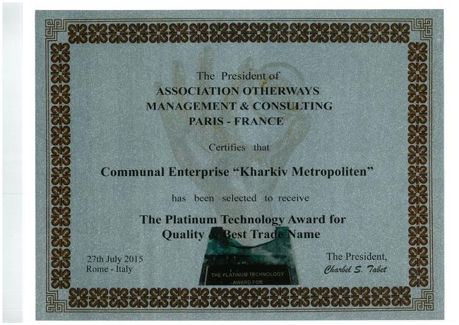 КП "Харківський метрополітен" отримало платинову нагороду Європейської асоціації Otherways (Париж, Франція) за високу якість і кращу торгову марку.