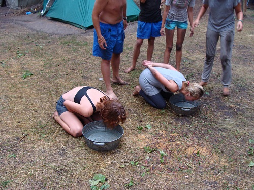 Ловля риби. Хто швидше зловить і з'їсть огірок, плаваючий в тазику, - причому зробити це треба без допомоги рук!