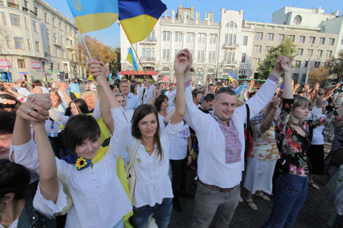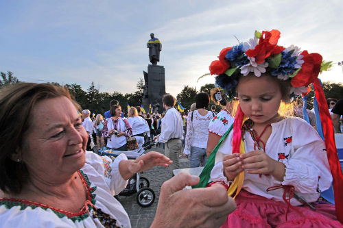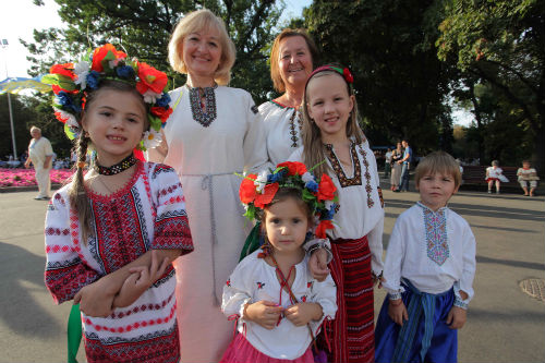 Патріотична хода сотень людей, одягнених у національні вбрання, стартувала у сквері "Стрілка" біля пам’ятника святому апостолу Андрію Первозванному.
