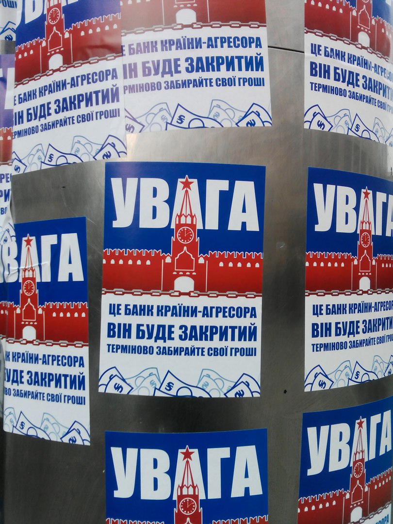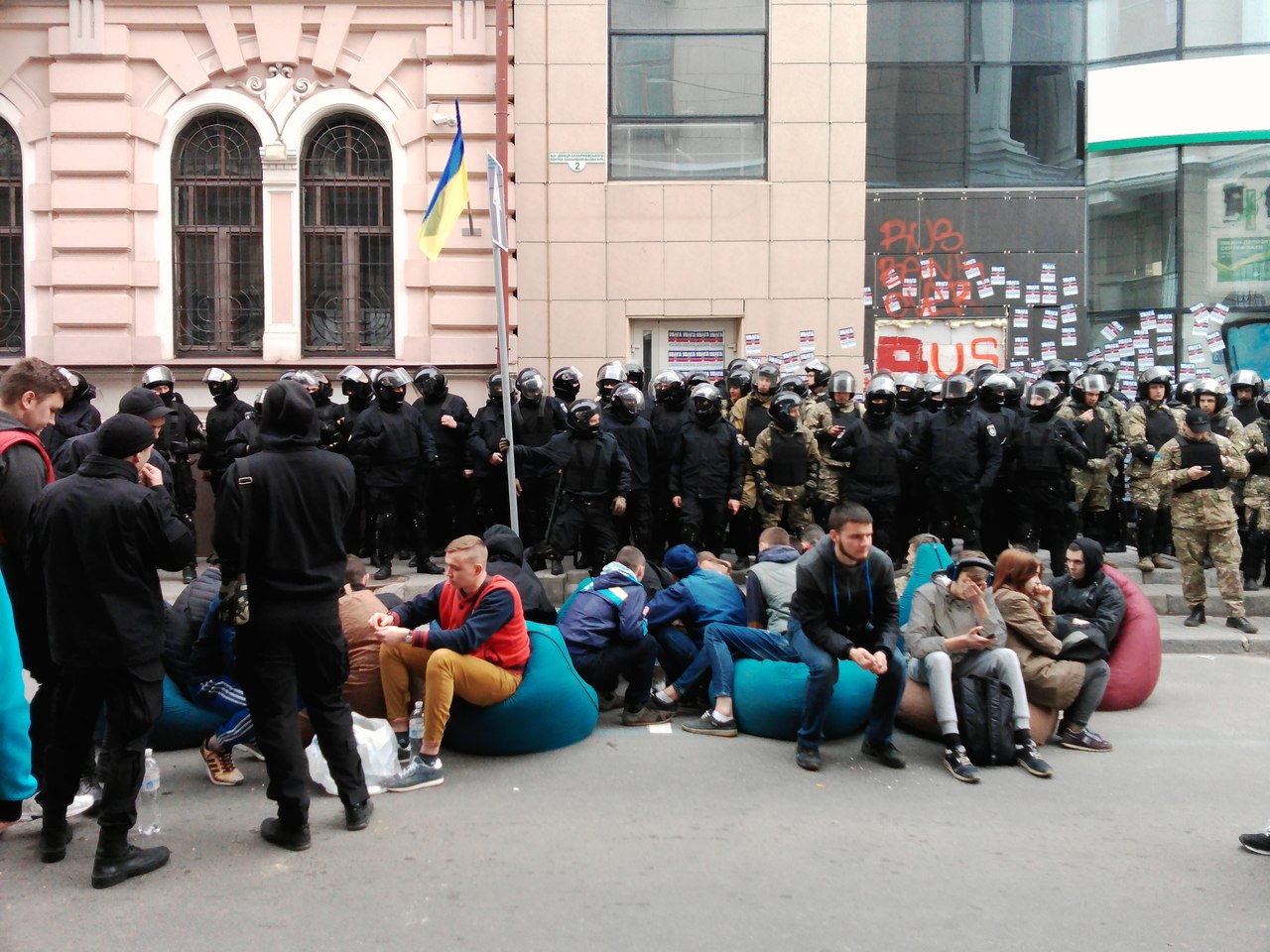 Стіни закладу обклеєні листівками і размальовані графіті, біля центрального входу в будівлю банку - пляшка із горючою сумішшю і бруски схожі на дерево.