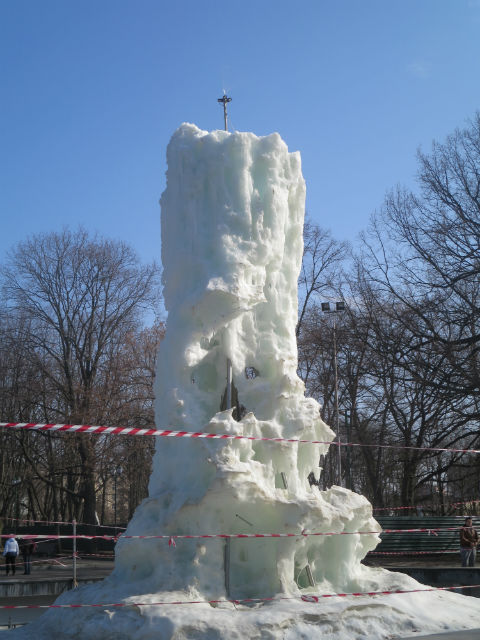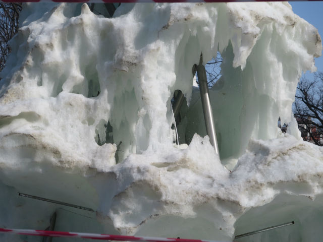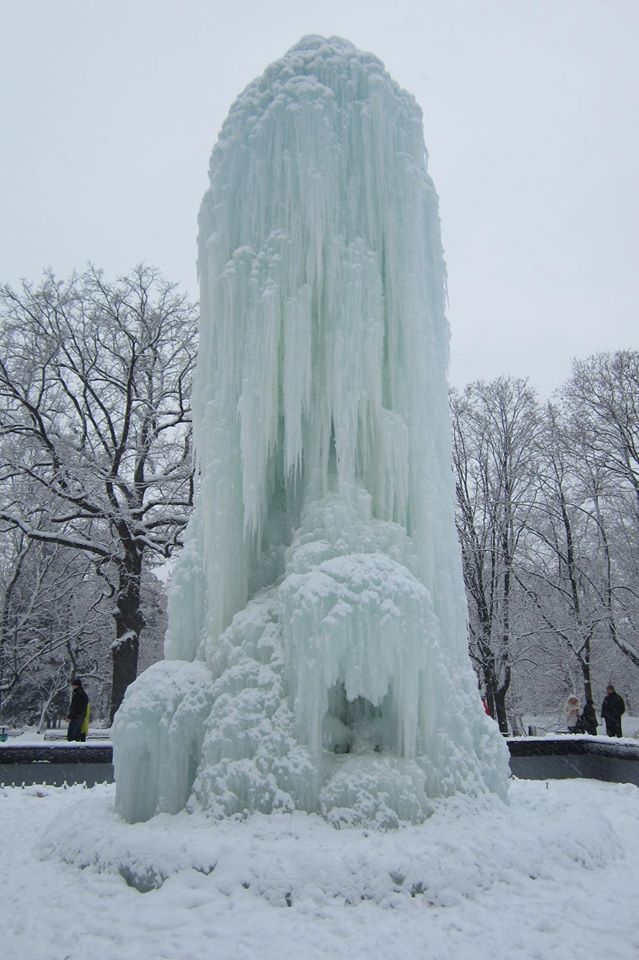 Із потеплінням замерзлий фонтан почав руйнуватися. Його обгородили попереджувальними стрічками, аби убезпечити від обвалу льодяних брил прохожих.