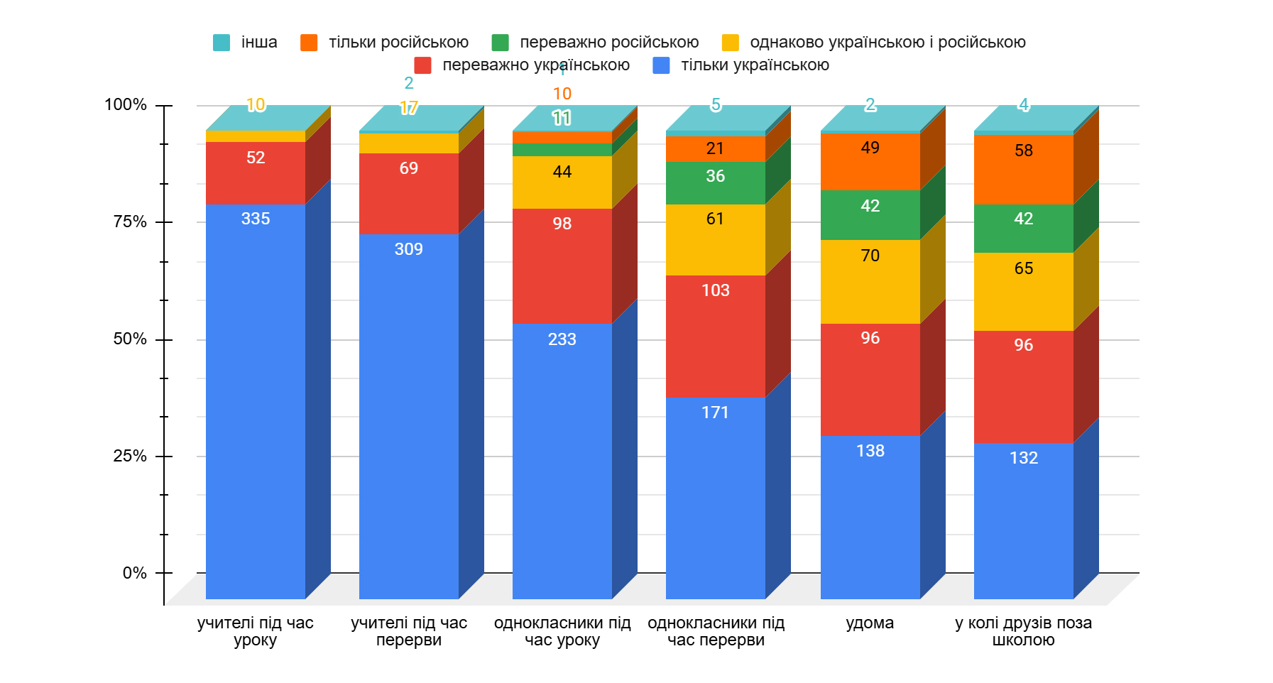 Показовим є те, що, у разі звернення до респондентів російською мовою, більшість із них все ж відповідає українською. Так, виключно українською мовою відповідають 77 % учителів, 50 % учнів /учениць і тільки 43 % батьків.