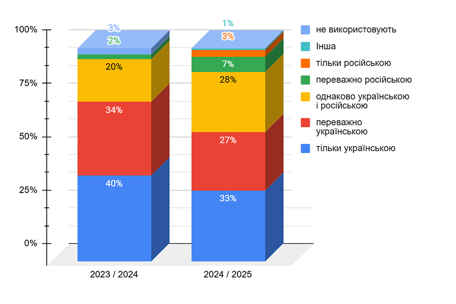 Серед батьків 55 % вважають українську мову рідною, що значно менше порівняно з попереднім роком (73 % у 2023/2024 навчальному році). Ще 32 % респондентів зазначили, що вважають рідною як українську, так і російську мови однаковою мірою (проти 19 % минулого року), а 10 % – російську мову (9 % минулого року).