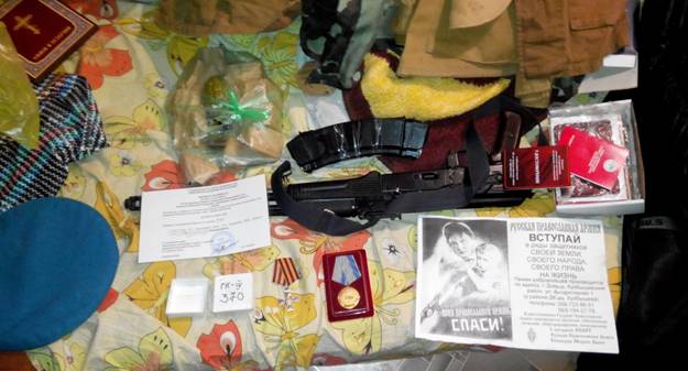У затриманого вилучили гранатомет "Муха", автомат Калашникова з двома спорядженими магазинами, сім пачок з патронами, чотири гранати, камуфляжну форму з терористичною символікою.