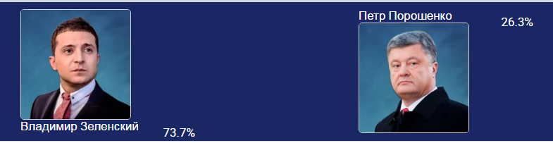 За даними Всеукраїнського екзит-полу, станом на 18.00 висуванець партії «Слуга народу» Володимир Зеленський отримав 73,7 % голосів українців. За чинного Президента України Петра Порошенка проголосувало 26,3 %.
