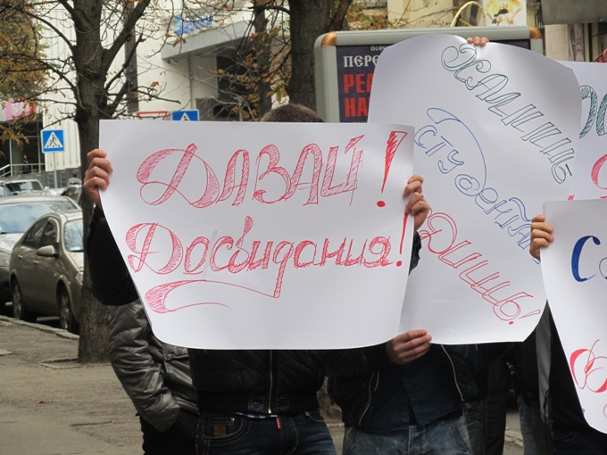 Молоді люди тримали в руках плакати з написами: «Давай, до свидания», «Студенты против наглости и хамства», «Хамишь студентам вредишь» тощо.