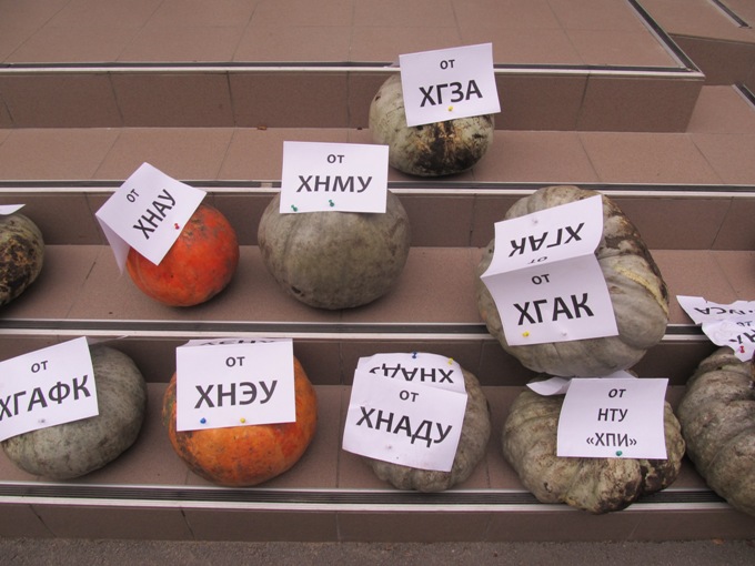 До приймальні також під'їхав віз, з якого вилізли молоді люди в українському національному вбранні. Вони взяли гарбузи з назвами вишів і склали їх під дверима приймальні. Всього своє невдоволення Авакову висловили студенти 14-ти вузів міста Харкова.